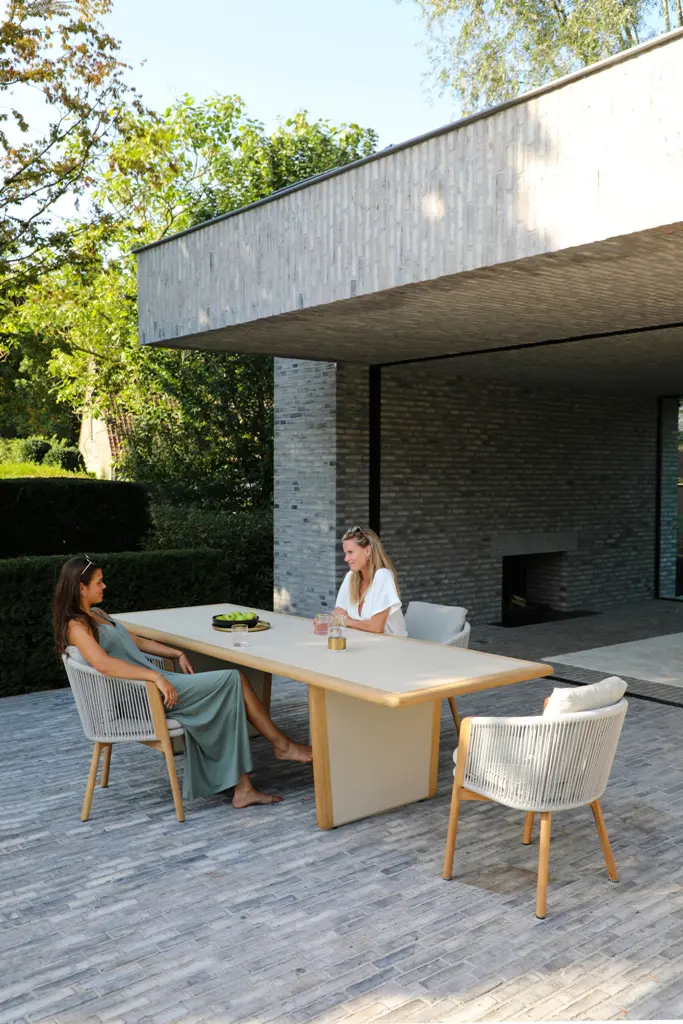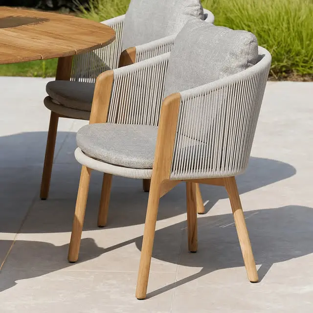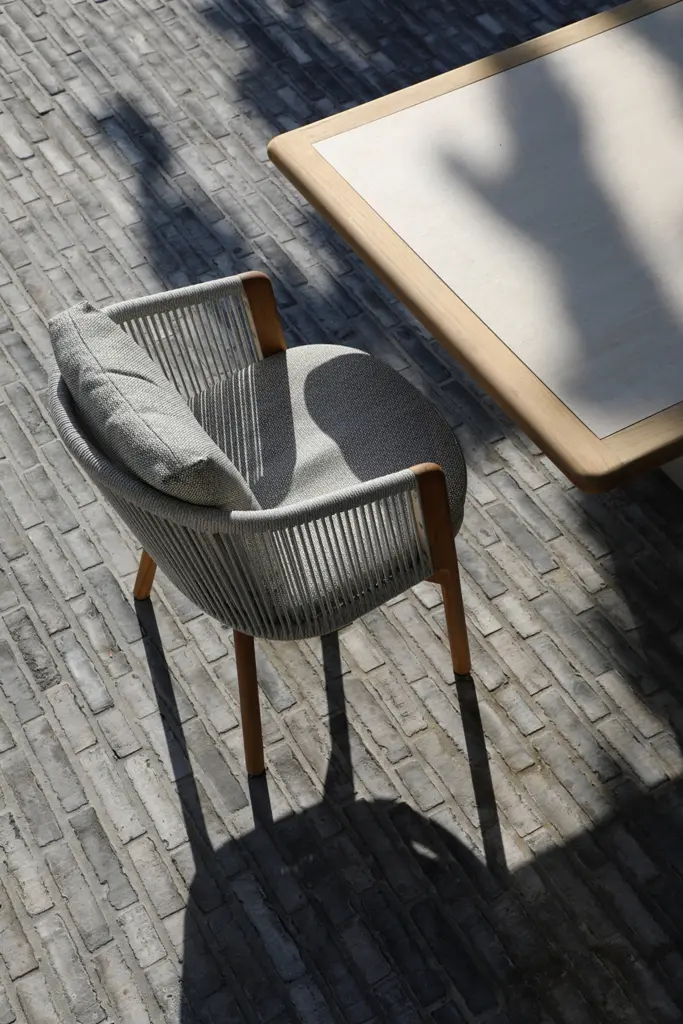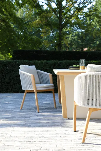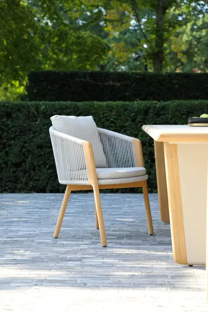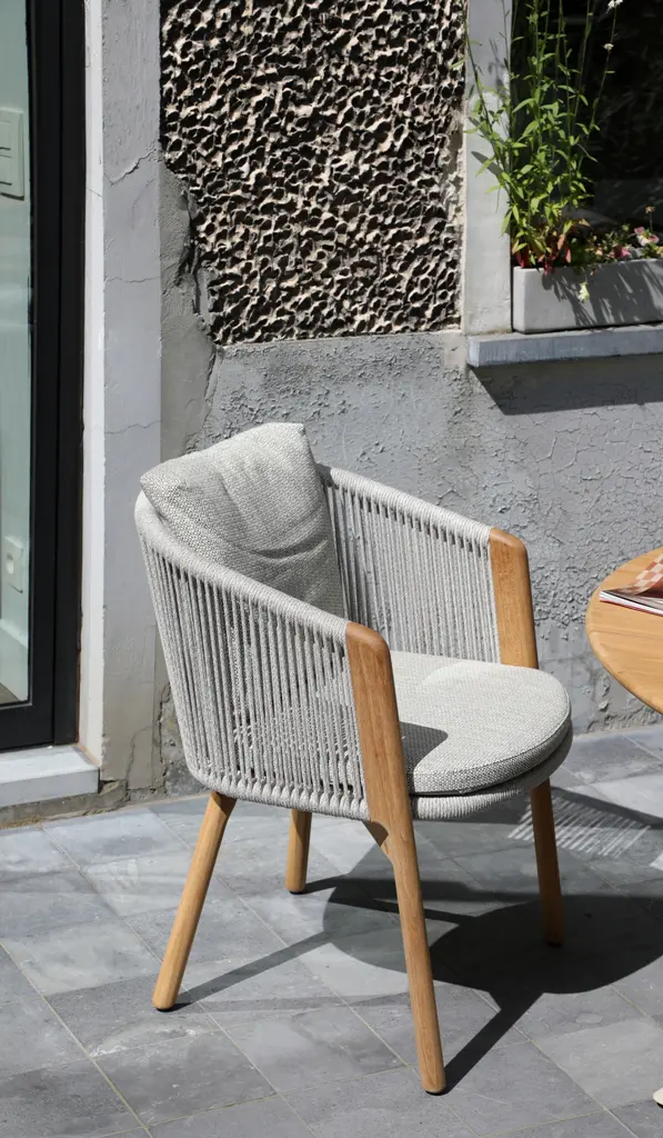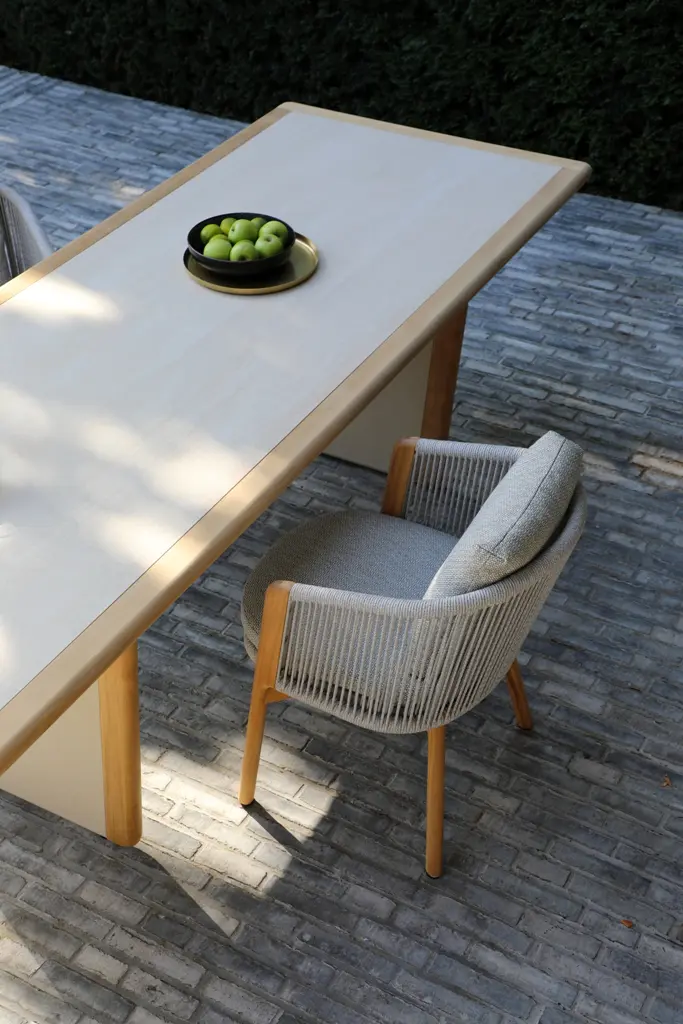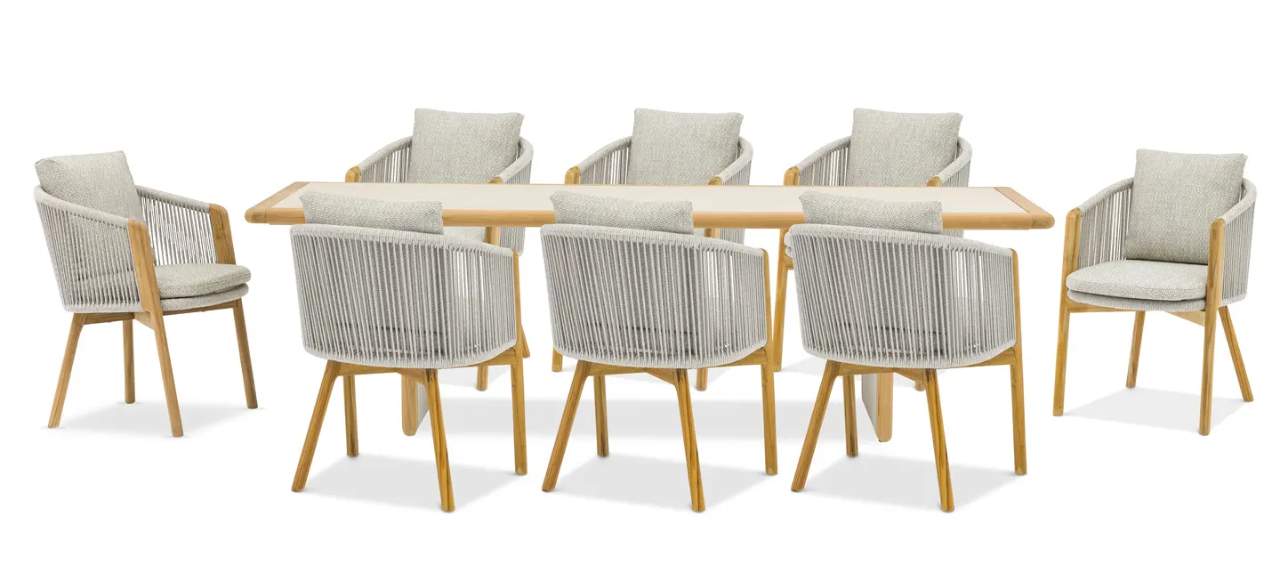 Обеденные столы имеют керамическую столешницу толщиной 6мм с краями из цельного тика. Алюминиевый каркас спинки сиденья кресла, ножки из тикового дерева FSC + олефиновая веревка, подушка с наполнителем из пенополиуретана, солнцезащитная ткань.