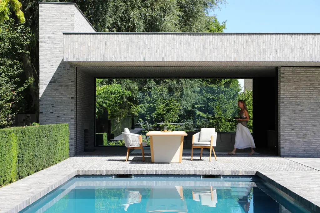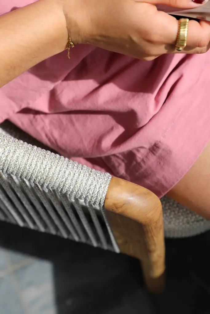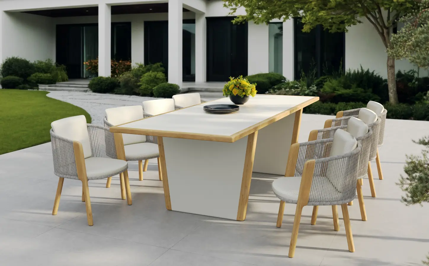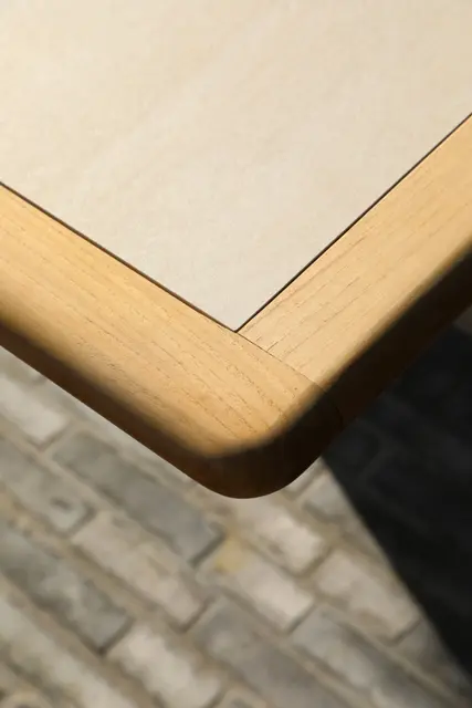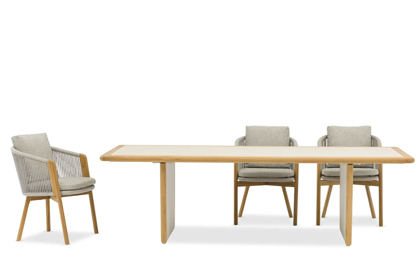 Обеденные столы имеют керамическую столешницу толщиной 6мм с краями из цельного тика. Алюминиевый каркас спинки сиденья кресла, ножки из тикового дерева FSC + олефиновая веревка, подушка с наполнителем из пенополиуретана, солнцезащитная ткань.
