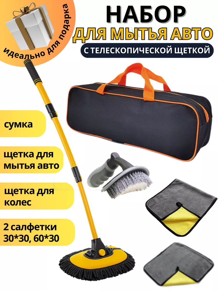 Сделайте практичный, полезный и качественный подарок себе и близким! Набор для ухода за авто станет лучшим выбором, который оценит по достоинству и мужчина, и женщина! В него входит телескопическая щетка для мытья авто, щетка для мытья колесных дисков, две автосалфетки и сумка для аксессуаров для машины. Все в одной сумочке! Очень практично и компакто уместится в багажнике авто.