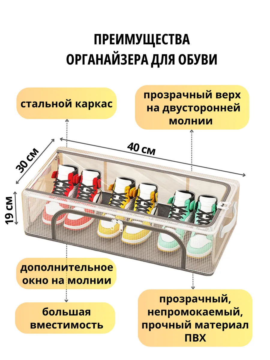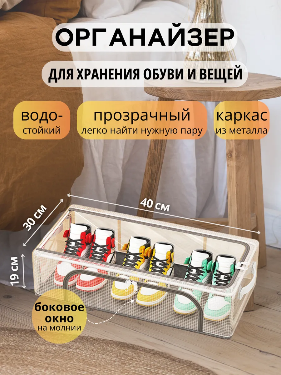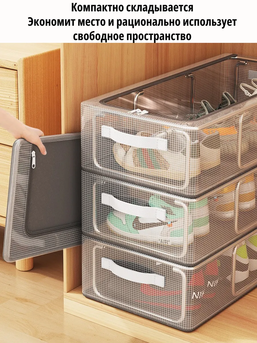 Стильный и практичный органайзер для хранения станет отличным средством размещения обуви, вещей, постельного белья, игрушек в спальне, прихожей, гардеробной или в детской комнате. Органайзер имеет 1 отделение, дополнительный проем на боковой стенке для быстрого и комфортного доступа к содержимому органайзера и прозрачную крышку на двусторонней молнии. Легко и компактно складывается, очень вместительный и удобный. Органайзер для обуви поможет рассортировать вашу обувь, вещи, белье, игрушки и удобно их хранить в эстетически приятном виде. Прозрачная крышка коробки для хранения позволит легко и быстро найти нужную обувь или вещь, не перебирая горы обуви и стопки одежды в шкафу. Порядок может быть легким и комфортным - сэкономьте время на свои увлечения, доверьте организацию хранения вещей нашим кофрам для хранения! Органайзер для дома имеет универсальное назначение и может быть использован для хранения любых вещей- обуви, одежды, игрушек, полотенец, постельного белья, несезонной одежды и обуви! Контейнер для хранения вещей имеет ручки, чтобы вам было максимально комфортно доставать органайзер с полки, переставлять его или переносить в другое место! Органайзер выполнен из водоотталкивающего материала, имеет крепкий стальной каркас и отличное качество- прослужит вам долго и подарит вашей обуви и вещам грамотное и бережное хранение!